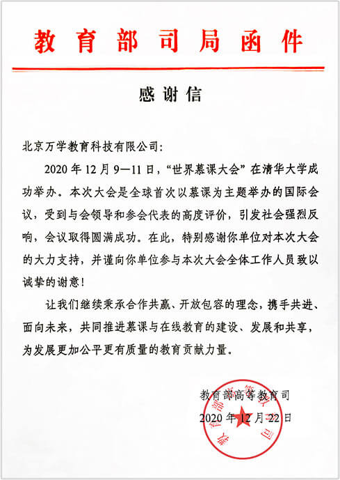 万学在配合教育部世界慕课大会的重要工作中做出了突出贡献,获得教育部重磅感谢信。